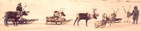1925: In January, during the worst blizzard of the Alaskan winter season, Leonard Seppala mushes 340 miles in five and a half days carrying diphtheria serum from Nenana to the storm-stranded people of Nome. Seppola's Siberian dog sled team lead by "Togo" is so exhausted that several fresh teams of dogs must be used to finish. The lead dog of the final team, driven by Gunnar Kasson, is named after Samuel Balto. When the serum arrives in Nome, "Balto the Dog" is accorded a hero's welcome and receives the place in history that might have gone to "Togo." A statue of Balto's dog will later be erected in Central Park, New York City, the only public art to honor a specific animal. Later still, "Balto's dog" will become the subject of the Walt Disney full-length animated cartoon Balto. 1926: To promote the sale of reindeer meat and furs, the Lomen brothers collaborate with Macy's Department Stores to stage yearly Christmas parades with Santa Clauses and teams of reindeer driven by Sami and Inuit herders from Alaska. The major US cities targetted include Portland, St. Paul, Boston, San Francisco, Chicago, Seattle, and Brooklyn. The Lomens write fake children's letters asking about Santa Claus and reindeer which are published in US newspapers. Because of the letters and the parades, Santa Claus and reindeer become an integral part of the North American Christmas story. 1927: Nicholas Dimond buys a few reindeer from the Lomen brothers and begins his own Christmas reindeer promotion. Charles Boostrom and Joe Thomas (an Ojibwe from Grand Portage, Minnesota) join him to tour the Midwest annually. The reindeer are kept at Clearwater Lake in Cook County, Minnesota. 1928: Four Inuit herders headed by Chester Seveck form an association to compete with the Lomen brothers but they find that they cannot compete with the large well-financed company that has begun to absorb small Inuit operations. The Lomen brothers begin the successful breeding of caribou with reindeer on Nunivak Island, producing larger reindeer. 1929: Seeing the Inuit and Yup'iks lose their share of the reindeer industry to the Lomen brothers, Isak Haetta and other Sami quit Lomen and Company in protest. The cattle industry lobbies to discourage further reindeer meat promotion. In October the stock market crashes and the Depression begins. The market for reindeer meat and fur sales declines and no new markets are developed. Game in the Northwest Territories is depleted. The Canadian government buys 3,442 Alaskan reindeer from Lomen and Company. Carl Lomen asks Anders Baer, an elder of sixty years living in Seattle, to lead the reindeer drive from Nabaktoolik, Alaska to Kittigazuit, NWT. Baer accepts and Mikkel Nilluka agrees to be his assistant. Other Sami include Andrew Bango, Tom Nakkala and Ivar West, and Inuits include Shelby David, David Henry, August Ome, Sam Segeok and Theodore Kingeak. The 1,200 mile drive is planned as an 18-month Canadian Reindeer Project. It becomes known as "The Great Trek" which stretches into a perilous five-year journey. Severe weather, high mountain ranges, ravenous wolves, and supply shortages contribute to constant delays and the death of reindeer. 1930: The number of reindeer in Alaska has grown to 500,000, but the industry is considered to be on the wane. The Lomen brothers continue to buy up the reindeer owned by the missions, the Sami and the Inuit and come to monopolize and control the industry in Alaska, including three of the most important shipping posts. They also hold strategic positions in state government and own the major retail stores where herding supplies are sold. 1931: Sami from Kautokeino are recruited to maintain the herd Baer is bringing into Canada from Alaska. The group includes Mathis Haetta, Aslak Tornensis, his wife Susanne Johannesdatter and their daughter, and Mikkel Nilsen Pulk, his wife Anna and their three children Isak, Nils and baby Ellen. These families become known as "The Canadian Sami." Ellen will marry into an Inupialeut family and later become mayor of Inuvik. Sixty years later her son Lloyd Binder and other family members will still be involved with reindeer. Continued > |