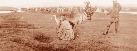 | 1890: Teacher/missionaries William T. Lopp and Harrison Thornton arrive at Cape Prince of Wales to establish a school. Sheldon Jackson arrives on his first Arctic summer tour with Captain Michael A. Healy aboard the U.S. revenue cutter Bear. Alaska is divided into allotments, which are assigned to Protestant denominations. Among them are: Bethel (Moravian), Point Barrow (Presbyterian), Tanana (Episcopal), Unalakleet (Swedish Evangelical Covenant), Teller, Nome and Shishmaref (Norwegian Lutheran) and Cape Prince of Wales (Congregational). Other Christian missions are established during the next few years, some with reindeer. Jackson promotes a plan to import reindeer from Russia to introduce reindeer husbandry to the Inupiaq as a solution to their loss of subsistence resources. Captain Healy, William T. Lopp, naturalist Charles Townsend and the Alaska Commercial Company have also been discussing this idea. Jackson believes that the Eskimos in northwest Alaska are starving and on the edge of calamity because of over-hunting by commercial Russian and American whalers and fishermen. He raises $2,156. in private donations to purchase the first reindeer and supplies. Jackson also has ideas about changing the Inupiaq from hunters into herders, converting them to Christianity, and incorporating the introduction of reindeer into the mission school system. In addition, he sees unique possibilities for reindeer solving transportation, food, employment and other natural resource problems. He believes that the Sami would be central to solving these problems by teaching reindeer husbandry to Alaska Natives. 1891: Sixteen Chukchi reindeer are brought to Unalaska and Amaknak Islands in the Aleutians in the fall to see if they can survive the winter there. Fourteen survive and are taken to Teller, on the Seward Peninsula, where two calves are born. They are the first of 280 reindeer that will be used as breeding stock between 1891 and 1902.